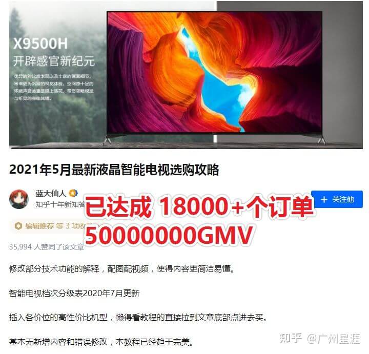 的文章电视选购攻略,全文仅有9460字,七成内容科普液晶智能电视,从需求选品角度教育开始高段位的种草阶段已达成 18000+个订单,50000000GMV。