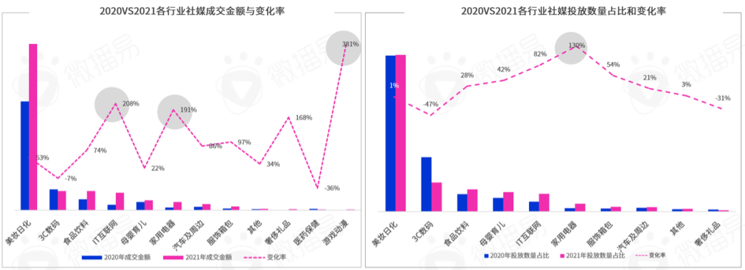 从入局行业类型来看,美妆、食饮等快消行业扩大投入抢占存量市场,耐耗类家电行业、体验类游戏动漫、交互类IT互联网行业在增量市场中抢占先机。相较2020年,2021年美妆日化行业有持续显著增幅,虽投放数量同比增长优势一般,但投放金额增长将近53%,且领先于其他行业,侧面印证KOL营销在美妆行业的投入产出效能优异。更有类似房产行业、家电行业等客单价较高、耐耗稳定型行业入局KOL营销,KOL营销价值体现在各细分行业,也在不断拓展其入局边界。