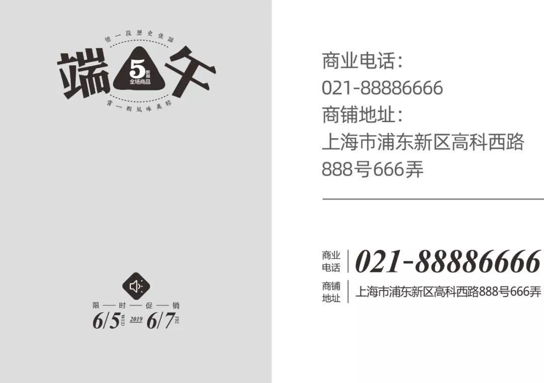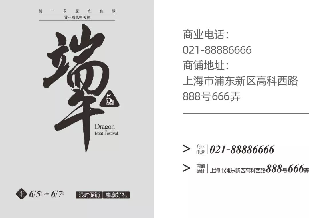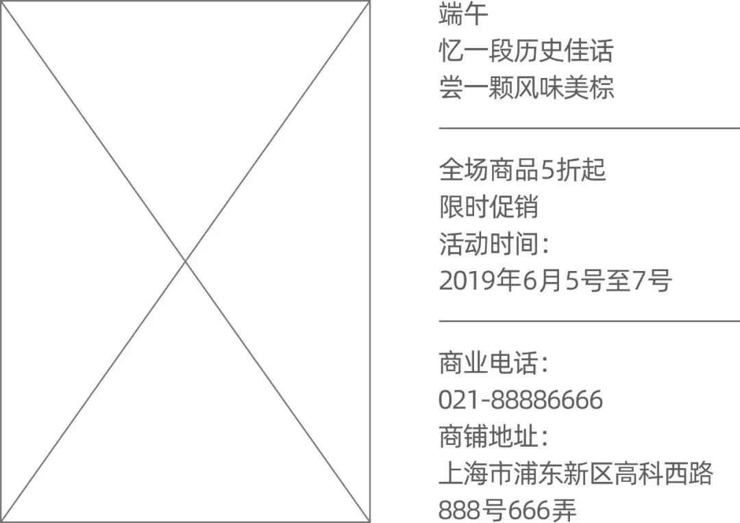 折扣信息可以将数字“5”放大处理,手绘粽子轮廓作为装饰图形。将时间信息符号化处理,并添加装饰图形。限时促销几个字可以断开处理,以短线串联,并与时间信息搭配成组。