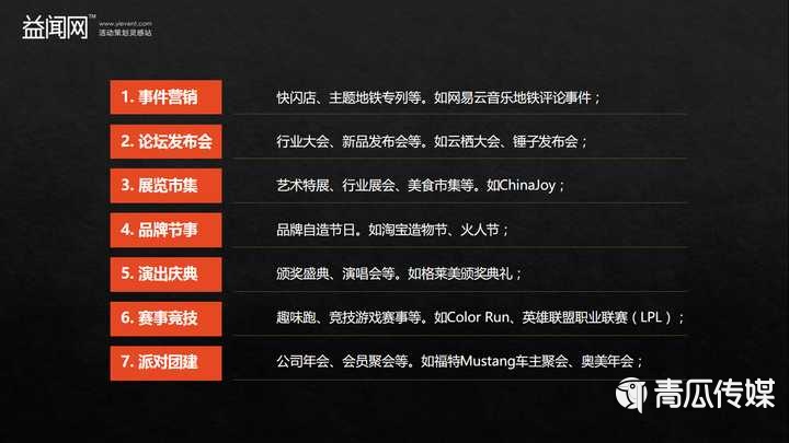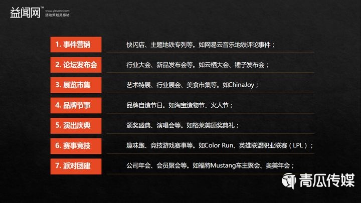 根据实战梳理,活动形式主要分为事件营销、论坛发布会、展览市集、品牌节事、演出庆典、赛事竞技以及派对团建等七大类型。