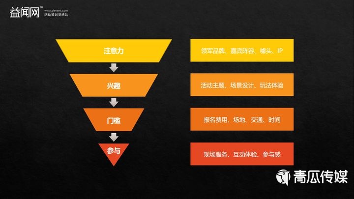 一个活动的策划要符合“注意力-兴趣-门槛-参与”原则。从吸睛的卖点(注意力)、到有趣的活动形式(兴趣)、友好的参与方式(门槛),最后是参与时的现场体验(参与),每个环节都要照料到。