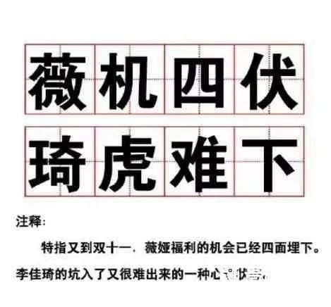 “薇机四伏,琦虎难下”,是当天晚上网民对两人直播间的形容:特指又到双十一,薇娅福利的机会已经四面埋下,李佳琦的坑入了又很难出来的一种心理状态。