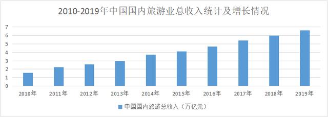 下表为2010年-2019年国内旅游业总收入统计,2010年至2019年旅游业总收入从1.57万亿元上升至6.63万亿元。