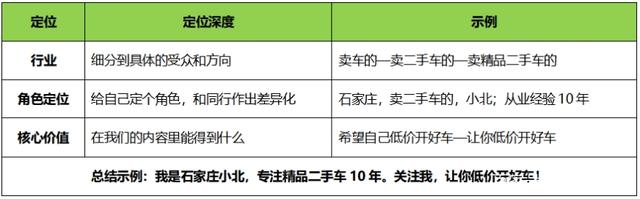 那到底应该如何做账号定位呢?其实并不复杂。给大家分享一个账号定位的公式:行业+角色定位+核心价值。每一项的拓展要有深度,细分到具体的方向上。以二手车行业为例,行业是卖车,往下细分是卖车行业里卖的是二手车。进一步细分下去,卖的什么类型的二手车?——卖的是精品二手车。同理角色定位和核心价值按同样的思路也可以延伸出来,具体定位方式可参考这个表格,并结合自己的实际情况套用: