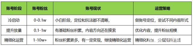 一个快手账号从新注册下来,到升级服务号,再到点亮蓝V,然后就是内容的运营。数据积累到不同阶段,内容运营的策略和玩法也是不一样的。小白阶段重在定位,放量阶段重点则是不断测试不同形式的内容来提升流量,发展到一定量级后再去做矩阵运营。表格中就是账号不同阶段的运营玩法。